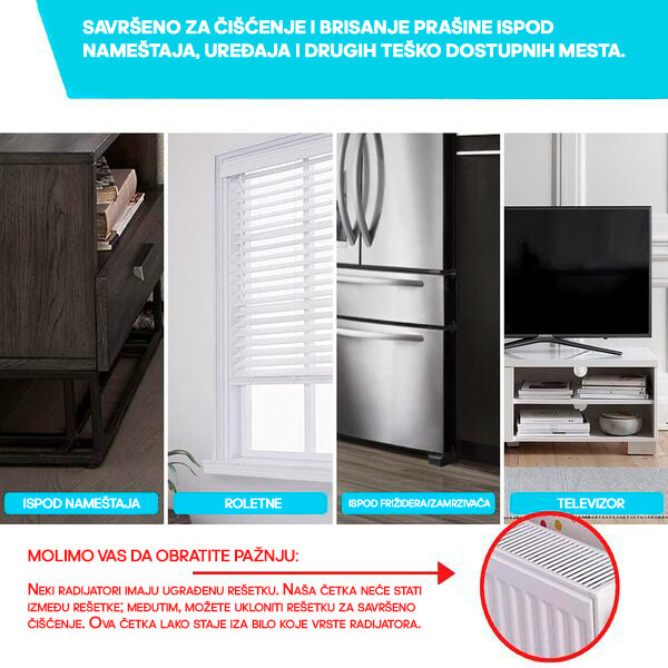 Zaboravite na skidanje rešetki i komplikovano čišćenje. Četka za prašinu dugog dometa dizajnirana je posebno za lako uklanjanje prašine iz radijatora.