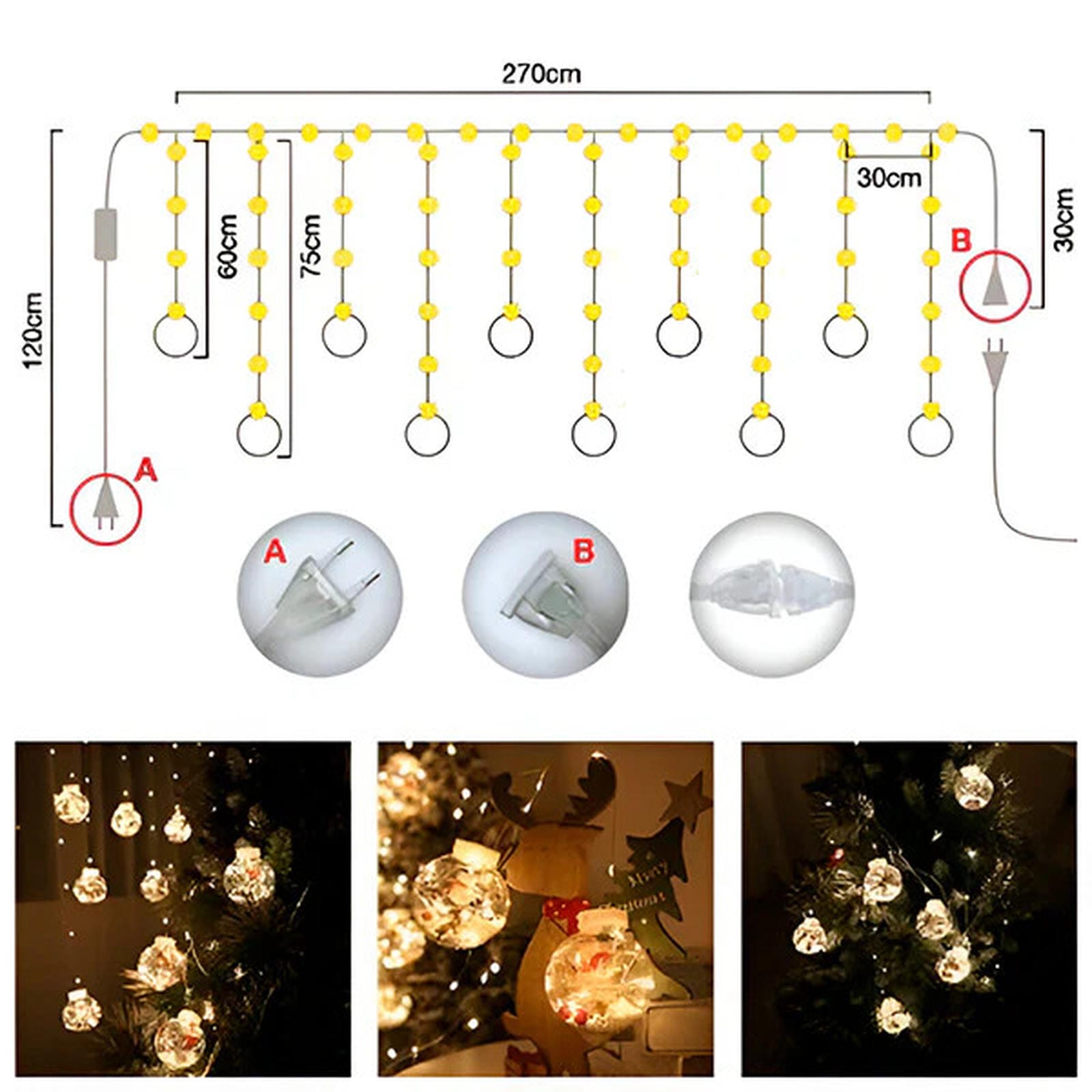 Transformišite svoj prostor u prazničnu čaroliju uz ovu LED zavesu sa prelepim kuglicama. Svaka kuglica krije unikatne detalje – figurice irvasa, jelki, sneška ili Deda Mraza, ukrašene snežnim efektom i nežnim LED svetlom. Idealna je za dekoraciju prozora, zidova, soba ili jelki, unoseći toplinu i svečani duh u svaki kutak vašeg doma.